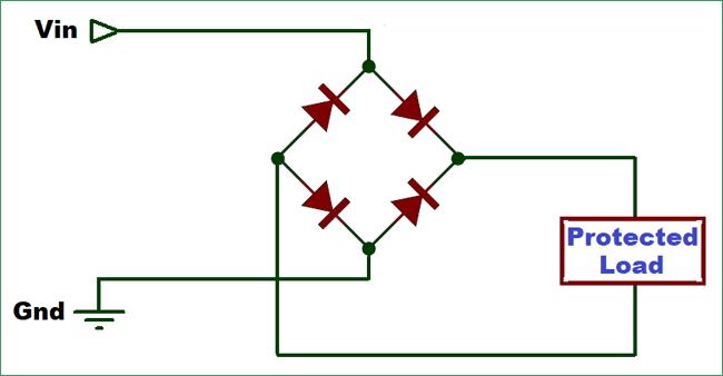 我们也可以使用全桥整流器进行防反接保护,因为它与极性无关。但是桥式整流器由四个二极管组成,因此在单二极管的上述电路中,功率浪费量将是功率浪费的两倍。