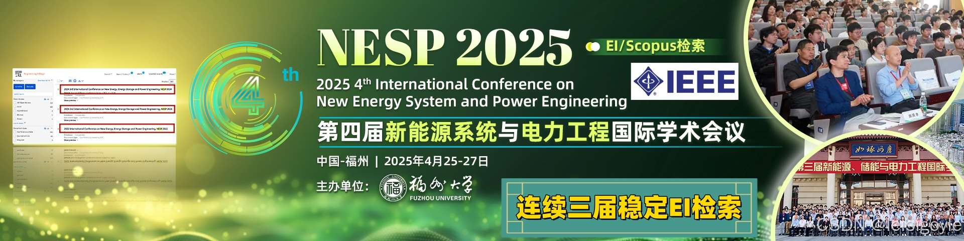 近几十年来,全球能源消耗迅速增加,因此寻找和开发性能优良的环保储能装置成为当前的研究热点之一。继前三届会议的顺利召开,第四届新能源系统与电力工程国际学术会议(NESP 2025)将于2025年4月25日至27日在中国--福州再次召开。会议主要围绕新能源科学工程、储能材料与电力工程等研究领域展开讨论。会议旨在为从事新能源科学工程、储能科学工程与电力工程研究的专家学者、工程技术人员、技术研发人员提供一个共享科研成果和前沿技术,了解学术发展趋势,拓宽研究思路,加强学术研究和探讨,促进学术成果产业化合作的平台。为了更好的促进会议发与学术交流,组委会决定从第四届会议起将会议名称由“新能源、储能与电力系统国际学术会议(NESP 2025)”改为“新能源系统与电力工程国际学术会议(NESP 2025)。