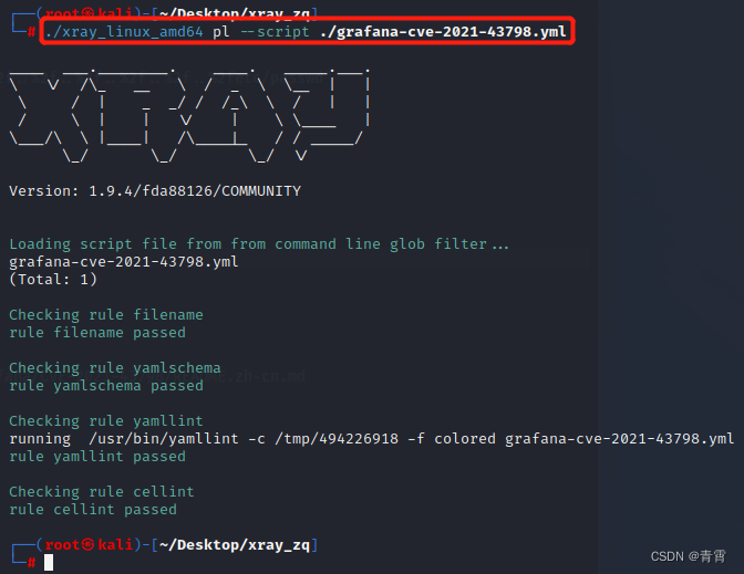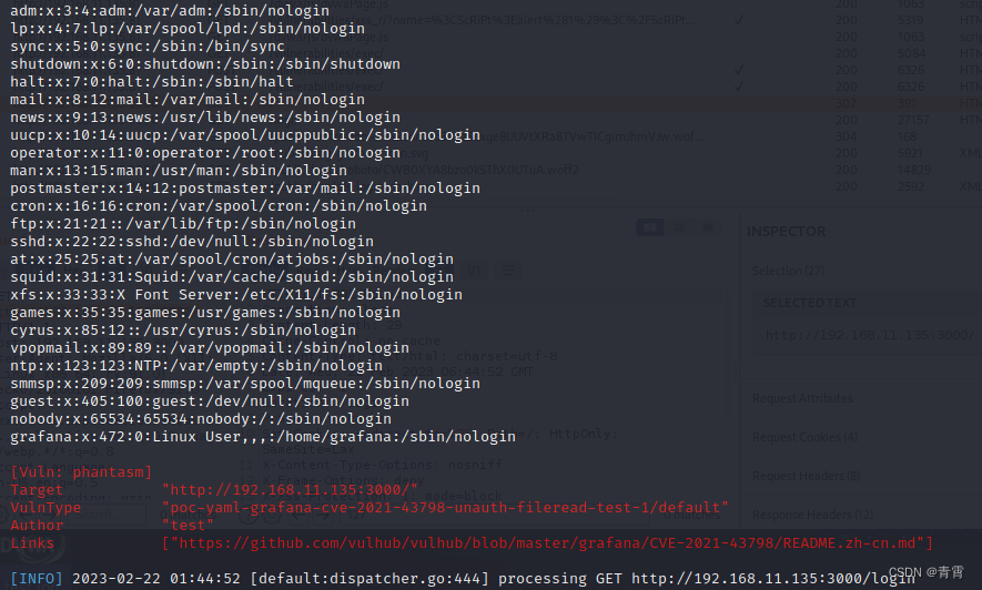 执行:./xray_linux_amd64 --log-level debug webscan --plugins phantasm --poc ./mypocs/grafana-cve-2021-43798-unauth-fileread-test-1.yml --listen 127.0.0.1:1111 --html-output grafana.html