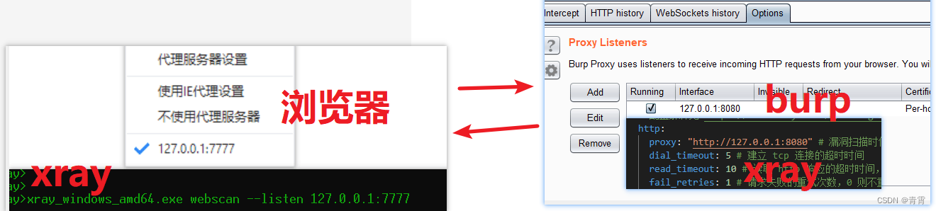 浏览器配置xray的的127.0.0.1:7777,xray配置burpsuite的127.0.0.1:8080