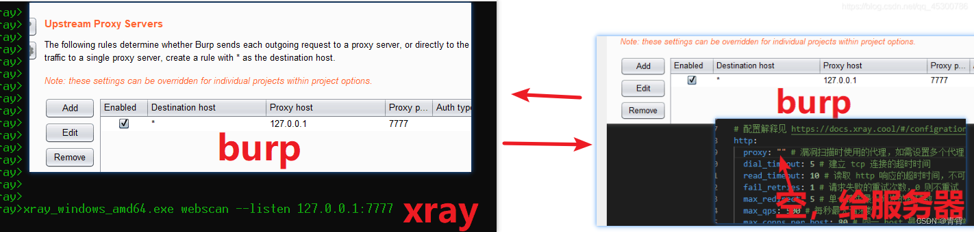 浏览器配置burpsuite的127.0.0.1:8080,burpsuite配置xray的127.0.0.1:7777