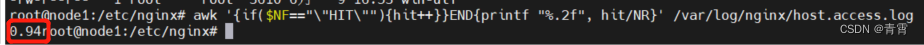 awk '{if($NF=="\"HIT\""){hit++}}END{printf "%.2f", hit/NR}' /var/log/nginx/proxy_cache_access.log