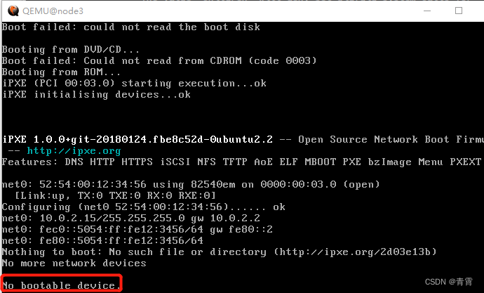 会弹出一个窗口作为虚拟机的显示器: 因为fedora.img中并未给虚拟机安装操作系统,所以会提示“No bootable device”,无可启动设备