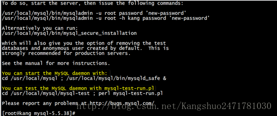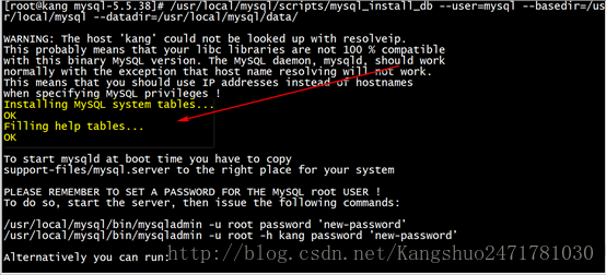 [root@kang mysql-5.5.38]# /usr/local/mysql/scripts/mysql_install_db --user=mysql --basedir=/usr/local/mysql --datadir=/usr/local/mysql/data/