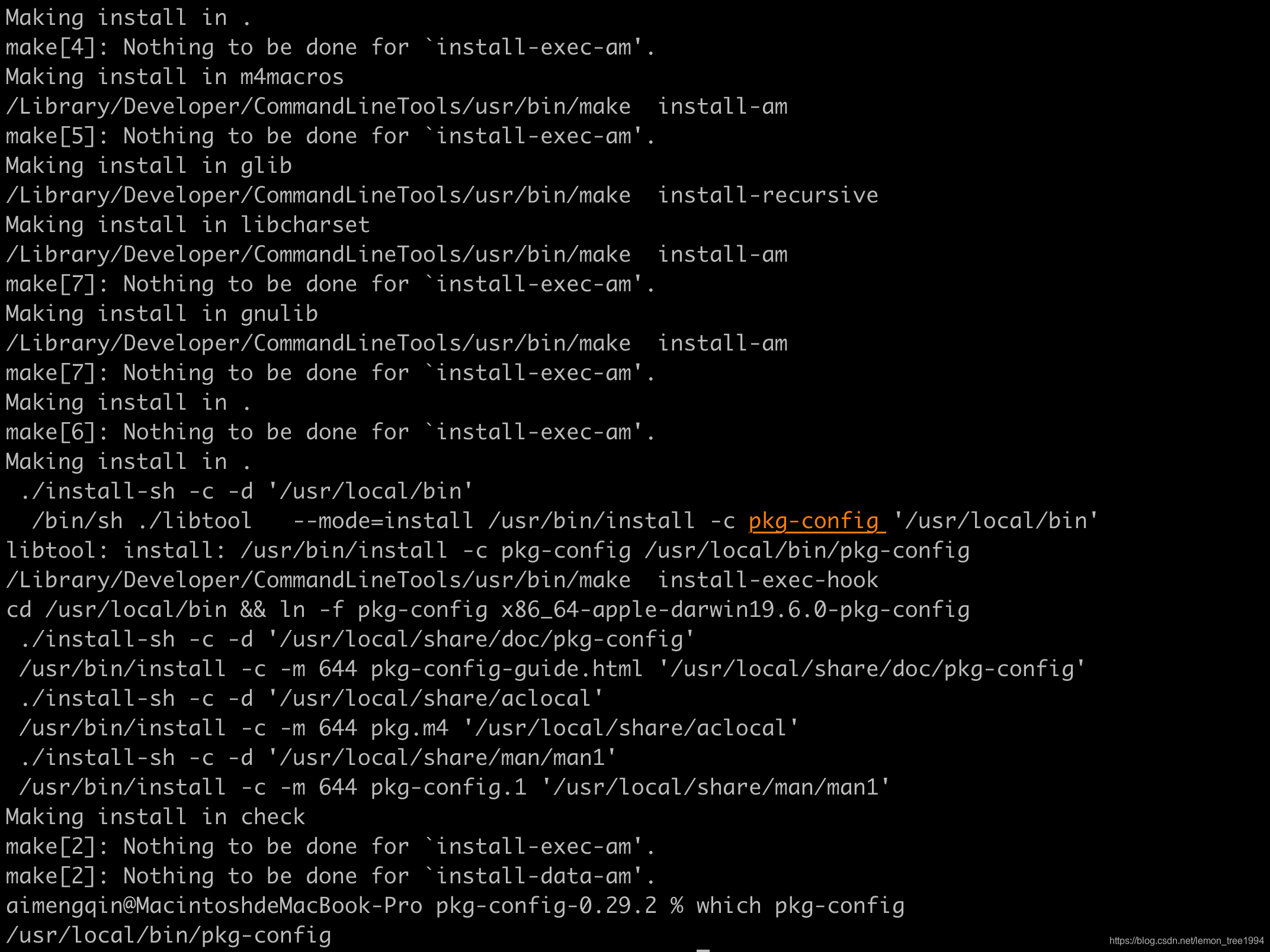 然后依次运行make、sudo make install;最后运行which pkg-config,输出路径/usr/local/bin/pkg-config,安装pkg-config成功。