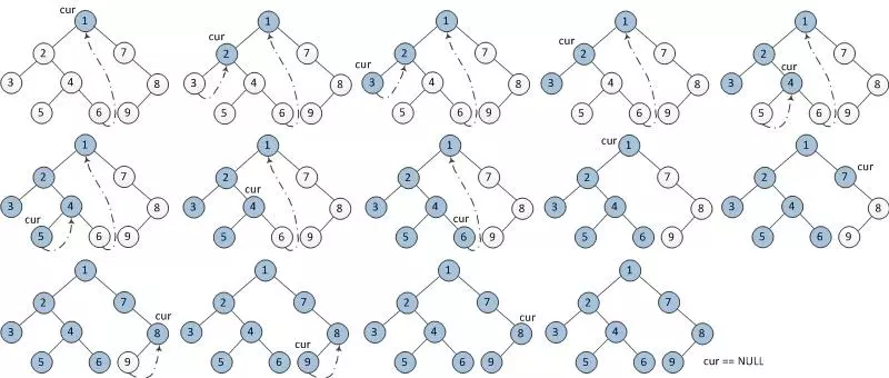 if(a->right == curr):a->rihgt = NULL,输出curr的值,curr = curr->right; //已线索化过了