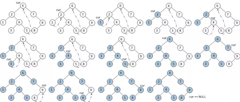 这里再次阐述一遍中序的实现,与前面链接的例子有一处不同(在处理节点间指向关系上),目的是与其他顺序遍历尽量保持一致,方便比较。