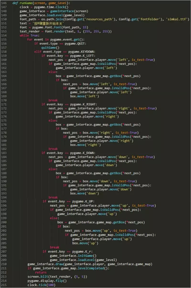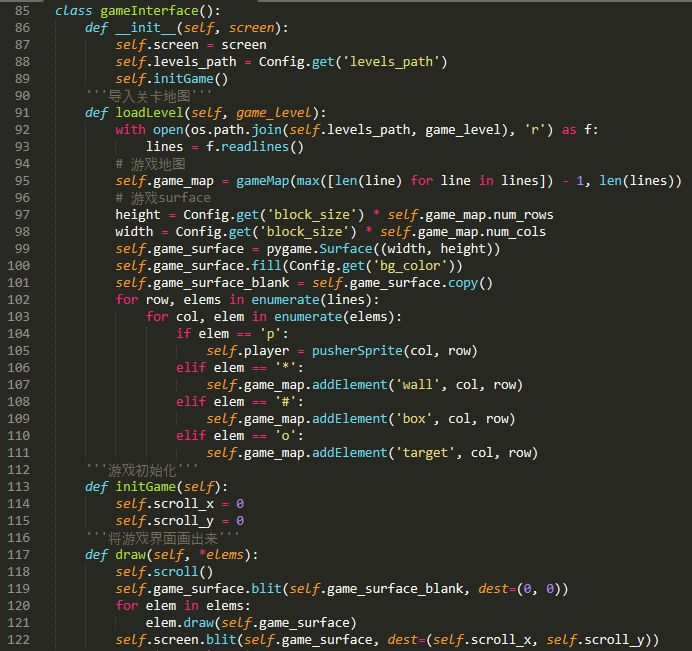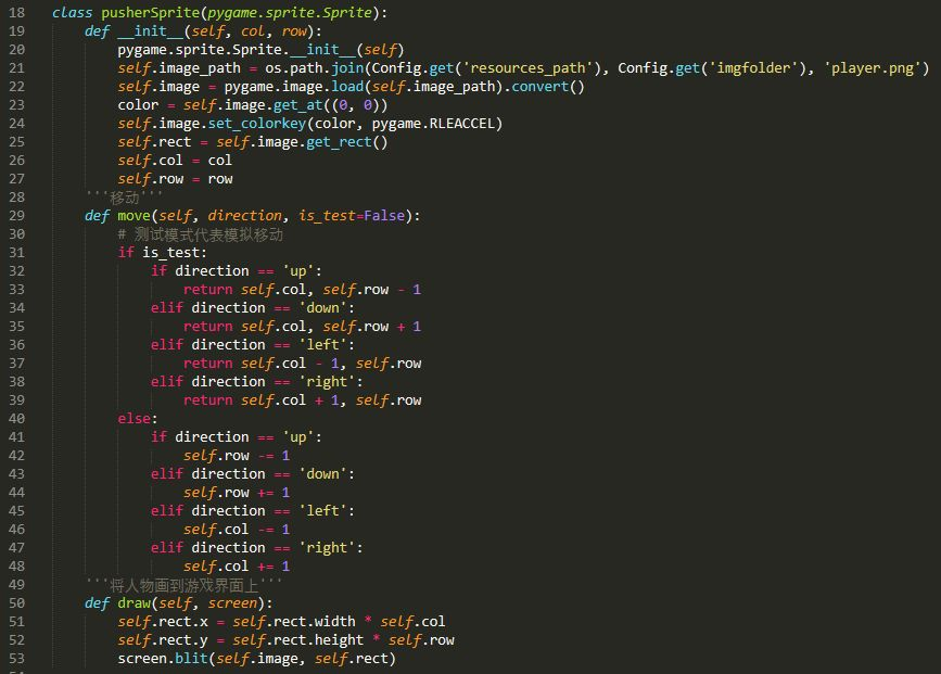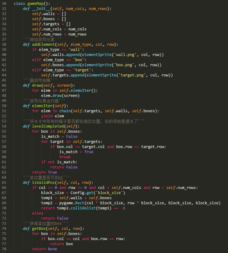 这里我们定义一个游戏地图类,目的是用该类来创建任意的游戏地图。因此,该类应当可以增加并保存游戏元素(人、墙、箱子等),并在屏幕上把地图画出来。同时也应当自带一个方法来判断此地图上的箱子是否都已经送到了指定位置(这样子方便切换关卡):