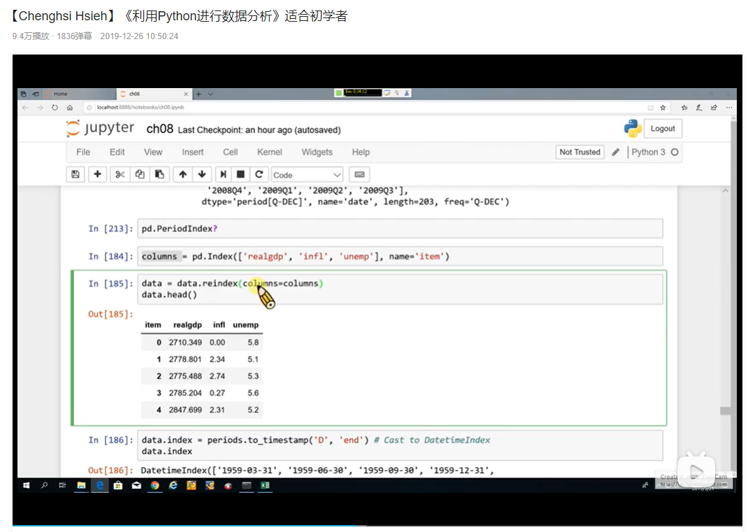 UP主叫 Chenghsi Hsieh,这套视频就是在讲《利用Python进行数据分析》这本书,东哥推荐过无数次了,还在视频号里赠送过纸质版。这个课程54节,以代码形式讲解Python数据分析的各种操作,Numpy、pandas、Matplotlib等,如果觉得自己学习书籍有难度,可以配合这个视频讲解一起学习。