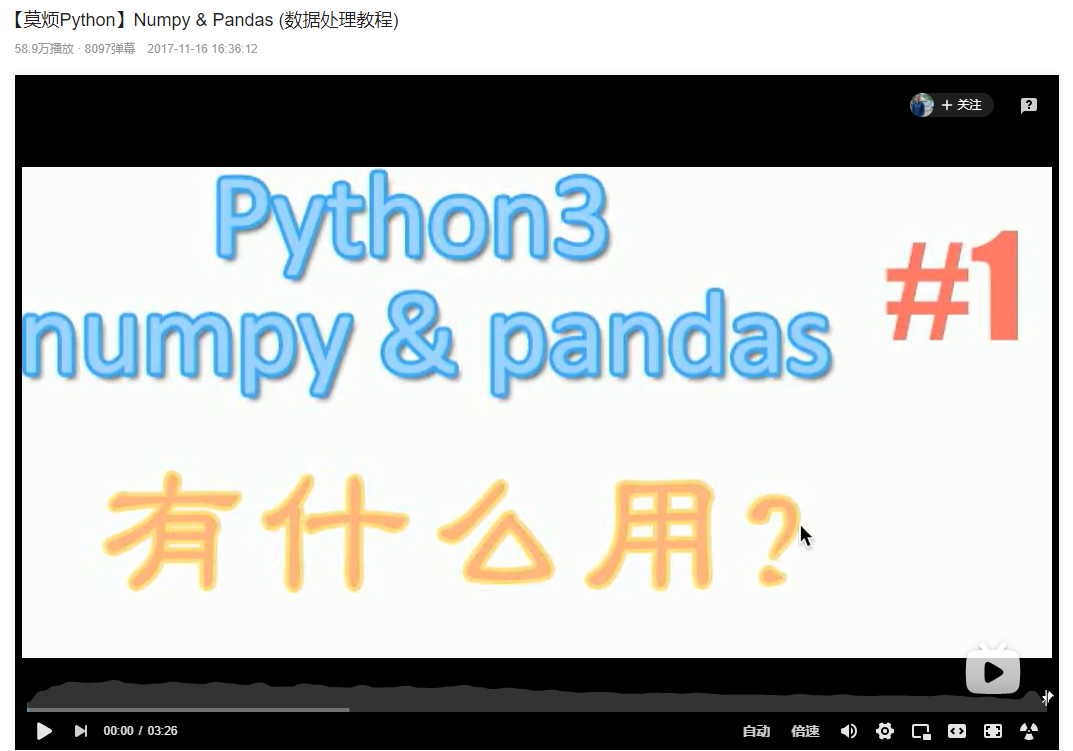 UP主莫烦,课程就是将Numpy和pandas如何进行数据处理的,简单粗暴,感兴趣直接跟着学就完了。另外,他的专栏还有很多系列也可以学习。