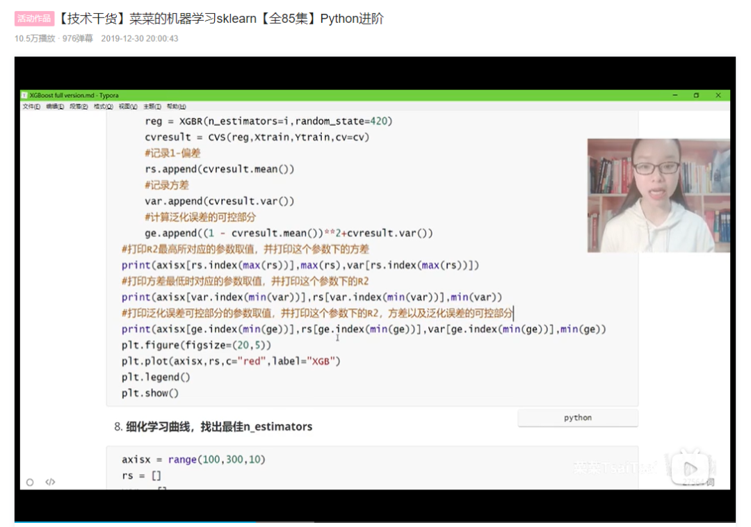 UP主菜菜,一个妹子,自称全站最贴心的算法老师,详细讲解了Sklearn的所有用法,从各种模型的工作原理、公式推导、以及代码实现,总共85节完结。另外她还有其他专栏单独讲解xgboost模型的,也都是一个非常不错的学习教程。