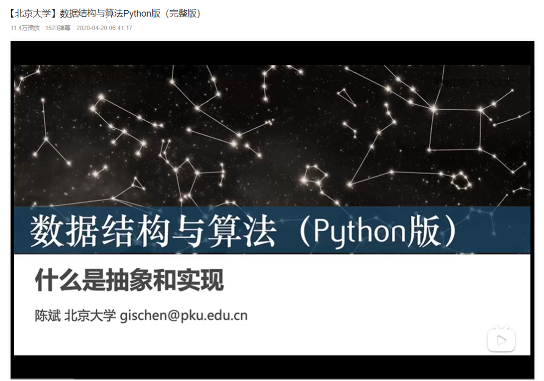 该课程是由北京大学陈斌老师主讲的,内容包括算法的分析、基本线性结构、递归与动态规划、排序与查找、树及其算法、图及其算法等,以Python语言讲解。
