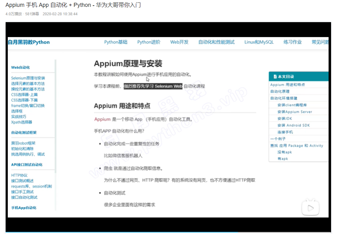 对于学习自动化测试的朋友,这个课程可以看下,作者白月黑羽,声音很好听。他的专栏下介绍了Selenium、Appium、Pytest的各种使用方法,无论是浏览器还是手机全部都可以搞定。