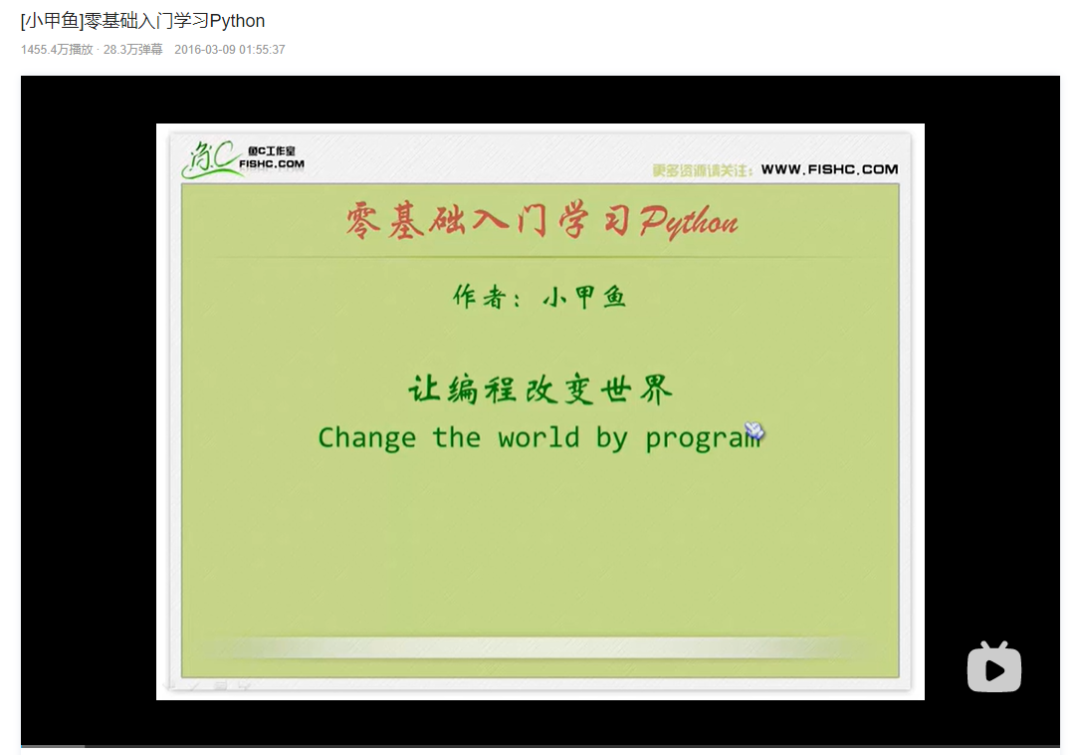 小甲鱼的这个教学视频在b站已经有1455万的播放量了,搜索结果排名第一名,全套共96节,课程有趣幽默,很多朋友都是通过这个入门的。如果你是零基础开始学习Python,这个视频比较适合,可以一步一步深入熟悉Python。