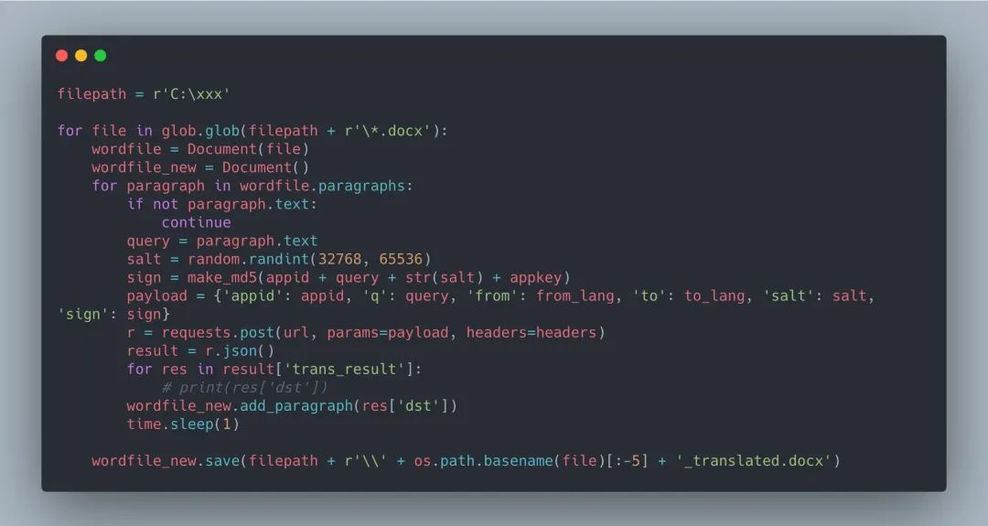 导入需要的模块,除翻译 demo 中需要的库外还需要 glob 库批量获取文件、python-docx 读取文件、time 模块控制访问并发。为什么要 os 模块见下文: