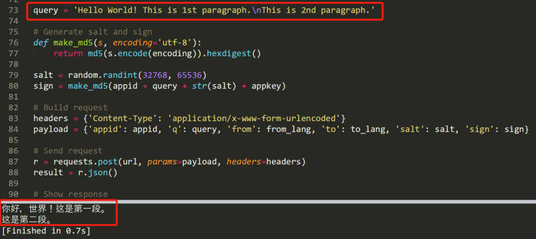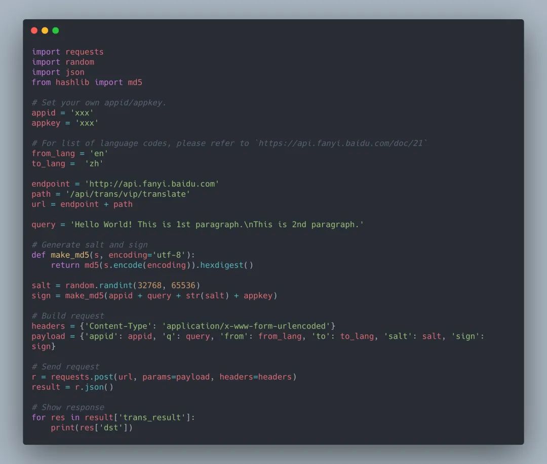 完成后在个人页面在即可看到 ID 和密钥,这个很重要!下面给出整理好的通用翻译 API 的 demo,已经对输出做简单修改,代码拿走就能用!