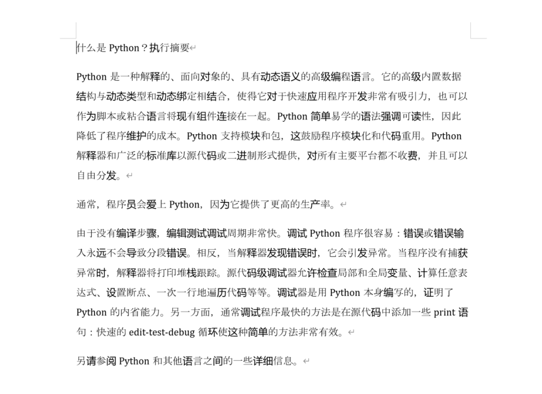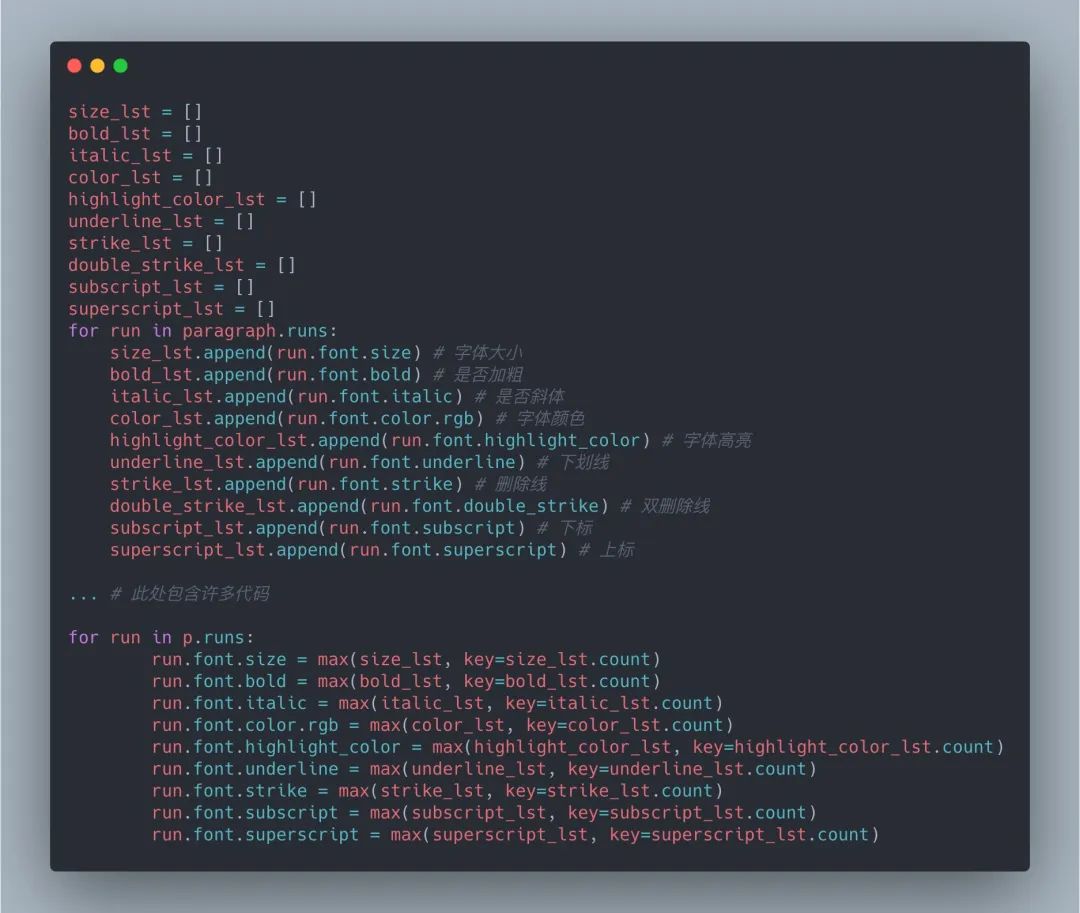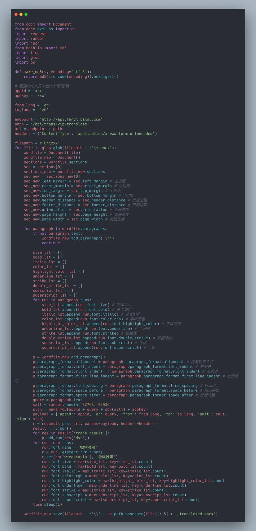 对于字号、加粗、斜体、颜色等样式调整,采取的策略是建立空列表,遍历原文档每一段每一个文字块,获取相应属性并放到各自的列表中,对同一段而言,其包含的文字块属性最多的选项赋值给翻译后文档的对应段落(如同一段全部或大部分的文字是加粗,则翻译后对应段落所有文字块均设置为加粗) 对NLP感兴趣的读者可自行尝试如何高度还原英文文档中某些特定词语的样式修改,并在翻译后的文档中体现出来
