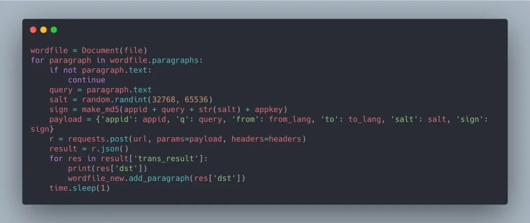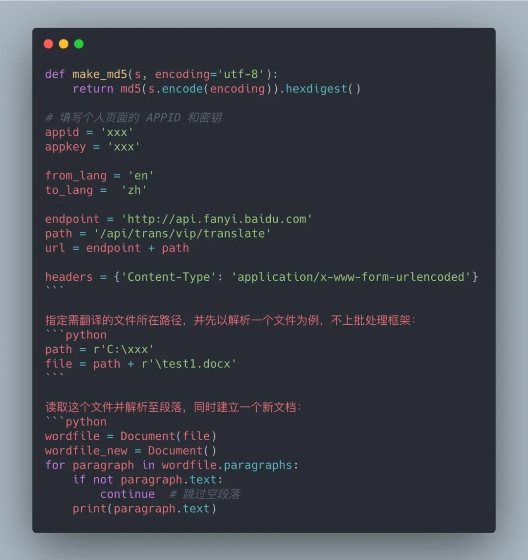 python-docx完成 Word 文件实例化后对段落进行解析解析出的段落文本交给百度通用翻译 API,解析返回的 Json 格式结果(上面的修改 demo 中已经完成了这一步)并重新写入新的文件