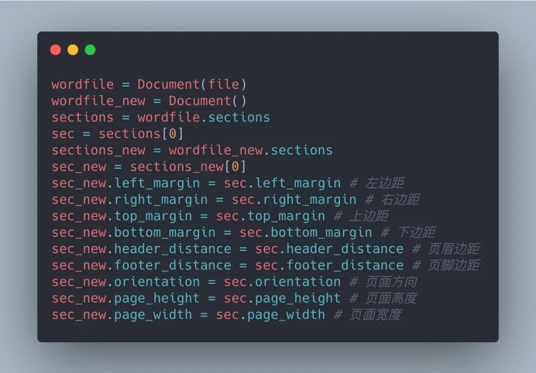 页面样式只要包括边距、方向、高度、宽度等等,从原文档中可以看到,采取的是窄边距。但我们无需知道窄边距四个方向应该如何设置,只需要在代码中呈现新旧文档的变量传递即可,具体如下