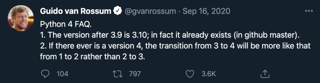 Van Rossum 回答说:「我和 Python 核心开发团队的成员对 Python 4.0 没什么想法,提不起兴趣,估计至少会一直编号到 3.33。」