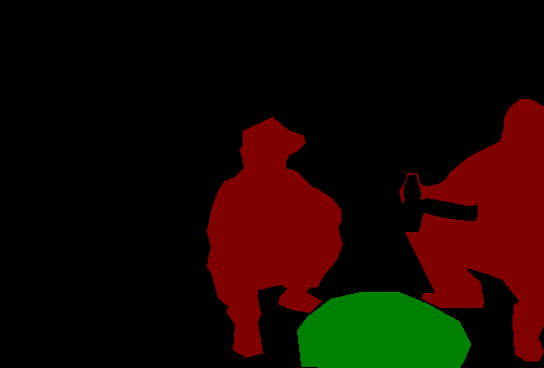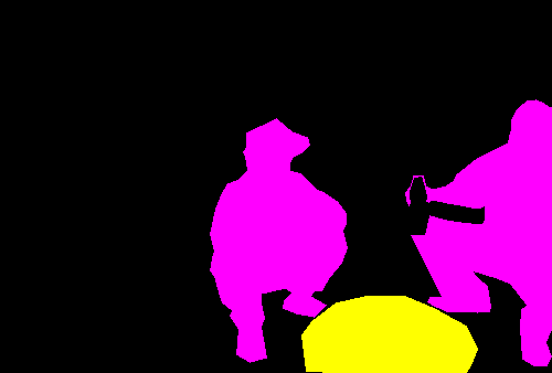 "label.png"就是语义分割需要的标签数据了。这张图像标注了两类区域(加上背景总共三类),一类是"person",另一类是"tabel",同一类别的区域用同一种颜色填充。