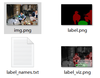 从上图可以看出,最终得到的标签图像,底层存储的数值按不同类别区域设置为不同数值,背景的每个像素数值设置为0,person的每个像素数值设为1,tabel的每个像素数值设为2。