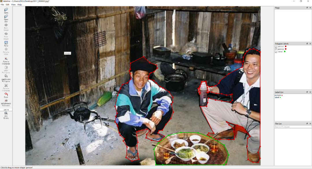 下面的json文件只展示了桌子的标注信息(上图中两个人的标注信息由于太长,故删去)。可以看到,"shapes"字段包含了整幅图像所有区域的标注点信息,具体的各个区域标注的点的信息都存在"points"里,它表示的是图像上构成多边形标注的各点坐标,"label"指明该目标区域的类别,"imageData"参数保存了原始图像的信息。