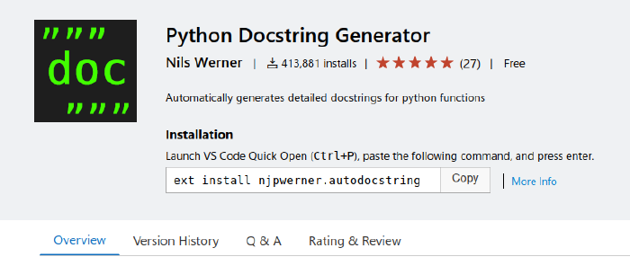 Python Docstring Generator 下载地址:https://marketplace.visualstudio.com/items?itemName=njpwerner.autodocstring