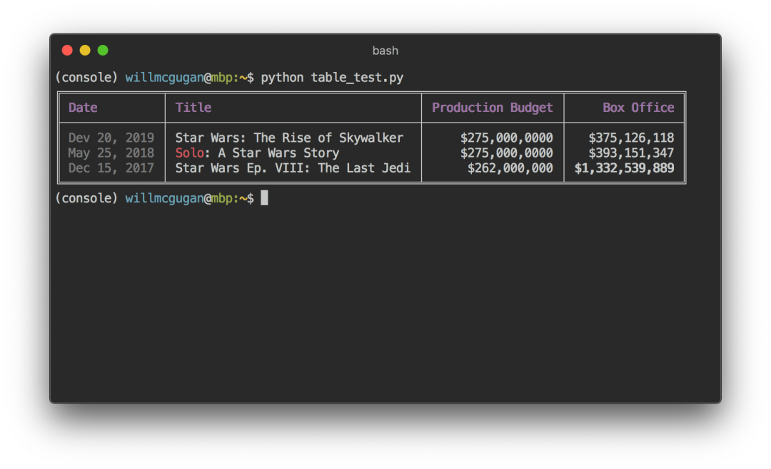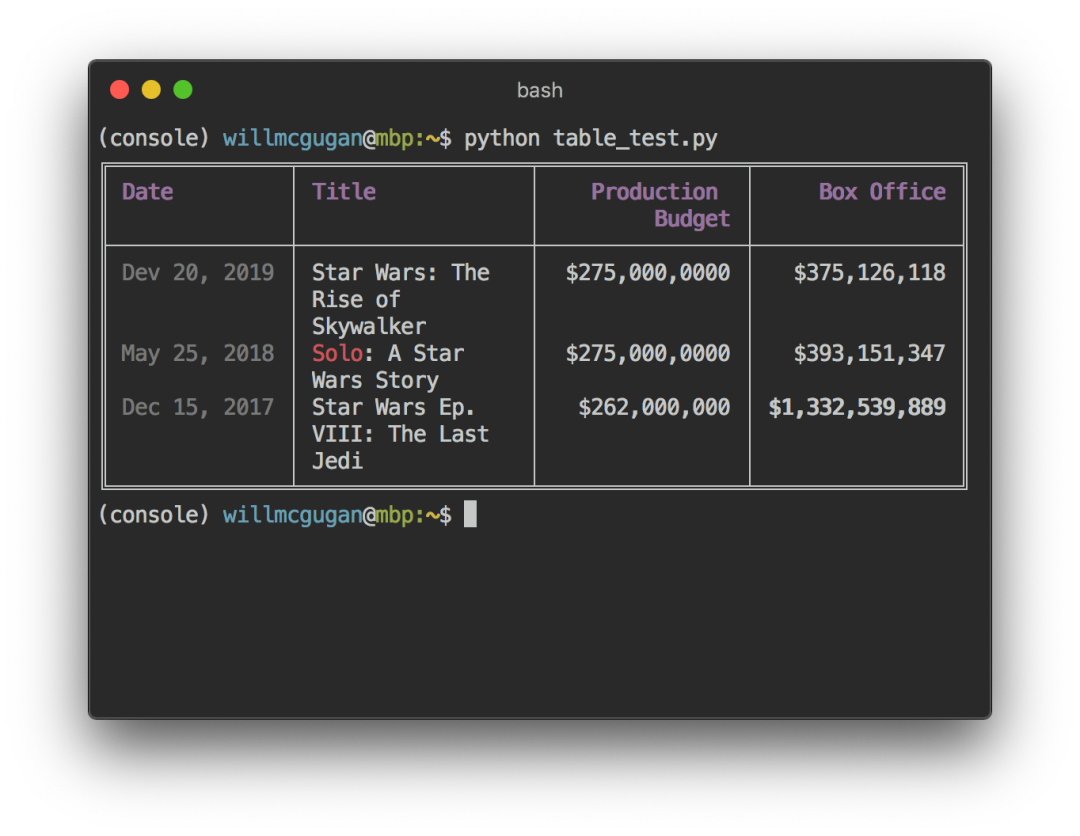 Table 类很聪明,可以调整列的大小以适合终端的可用宽度,并能根据需要做文本环绕的处理。下面是相同的示例,输出与比上表小的终端上: