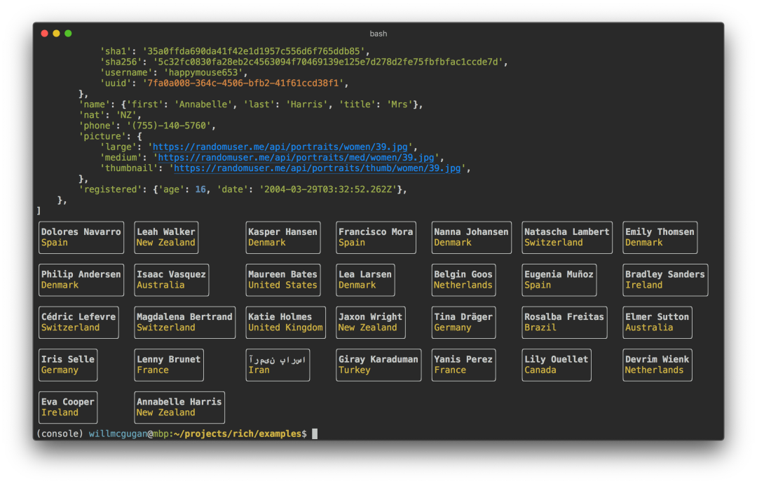 默认情况下,Rich 将针对 Python 结构和 repr 字符串进行语法突出显示。如果你记录一个集合(如字典或列表),Rich 会把它漂亮地打印出来,使其切合可用空间。下面是其中一些功能的示例: