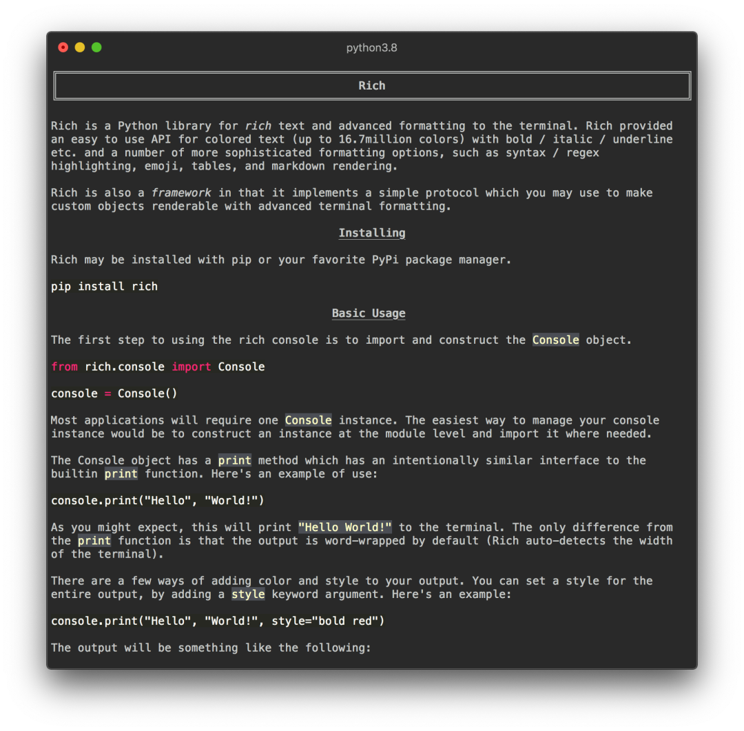 Rich 适用于 Linux,OSX 和 Windows。可与新的 Windows 终端一起使用,Windows 的经典终端仅限 8 种颜色。
