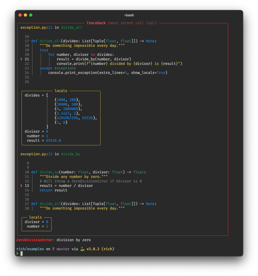 Rich 可以渲染漂亮的错误回溯日志,比标准的 Python 回溯更容易阅读,并能显示更多代码。