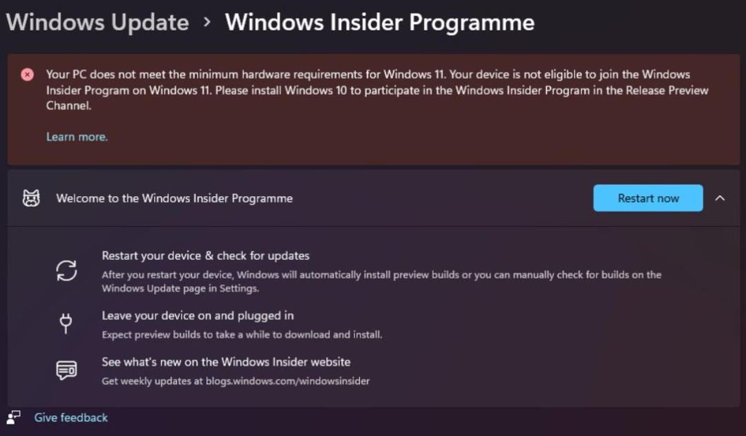 此外,微软正在迅速关闭在不合规硬件上安装新操作系统的途径。即使已经加入 Windows Insider 计划的 PC,如果硬件不合规也会被通知其应该降级到 Windows 10。