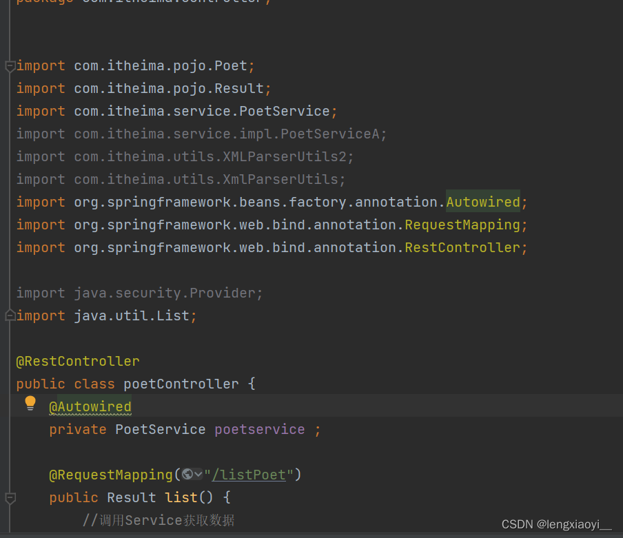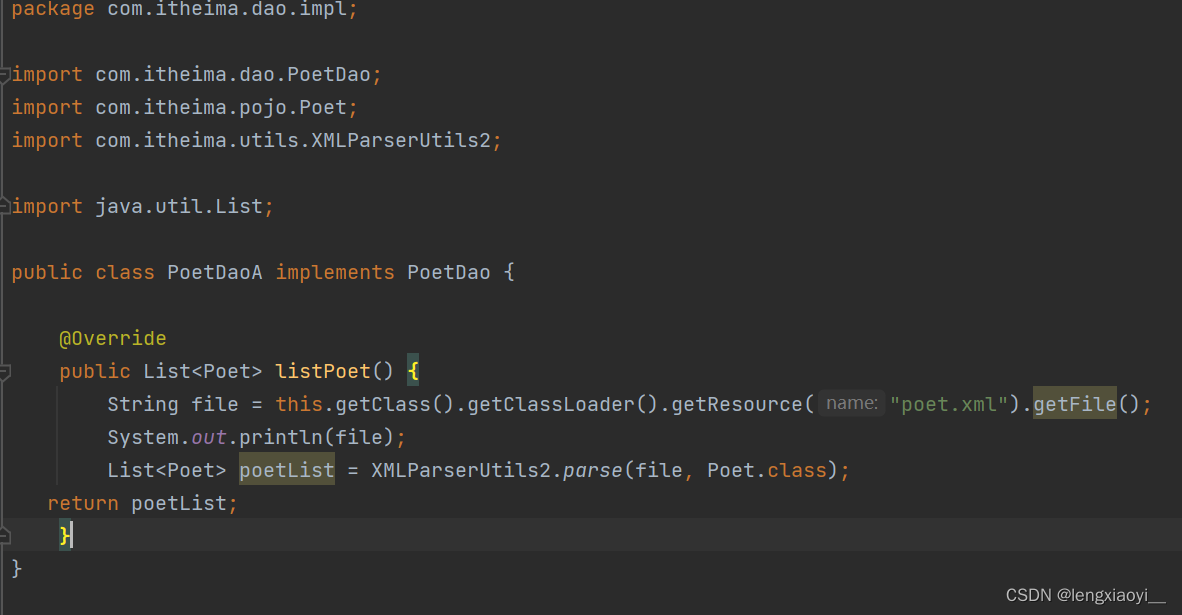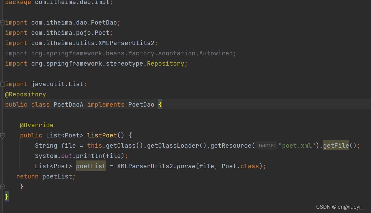 分层需分为三层,Dao,Service,Controller层,首先创造dao层,用于解析XML文件获取数据并存储至poetList中,这里需要创建一个接口和一个实用类,实用类用来存放解析XML文件的代码;接下来创建Service层,同样也是一个接口一个实用类,实用类中放逻辑处理的代码,service层要想获取Dao层中poetList中的数据,需要创建一个Dao对象,并调用实用类中的方法;Controller层同样如此,响应数据即可。