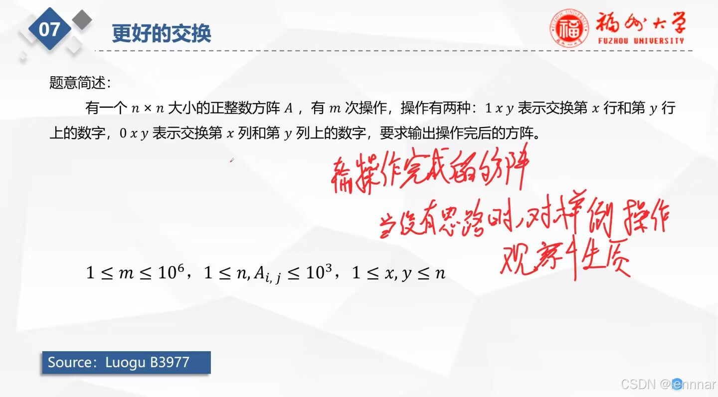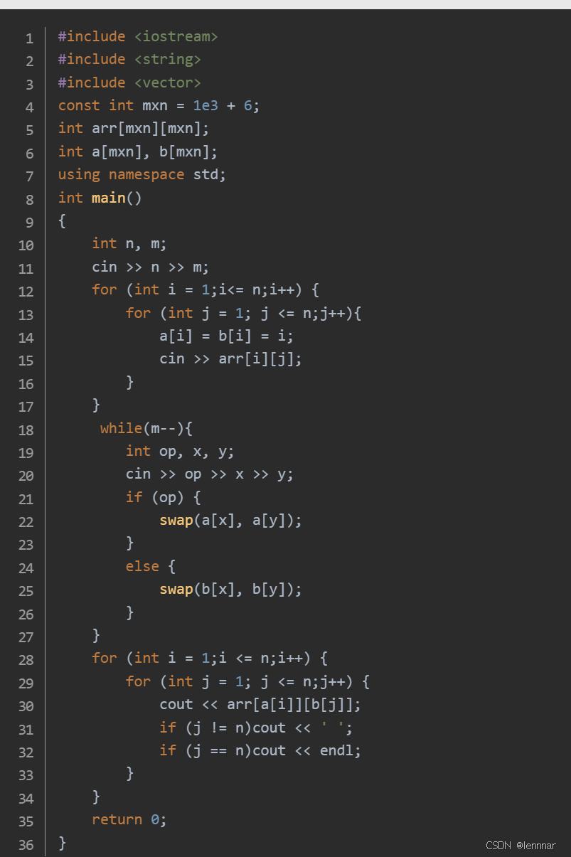 第七题直接模拟时间复杂度高,故不妨直接创建两个数组记录横纵坐标,然后按要求用swap交换坐标,最后利用arr [ a[] ][ b[] ]输出结果