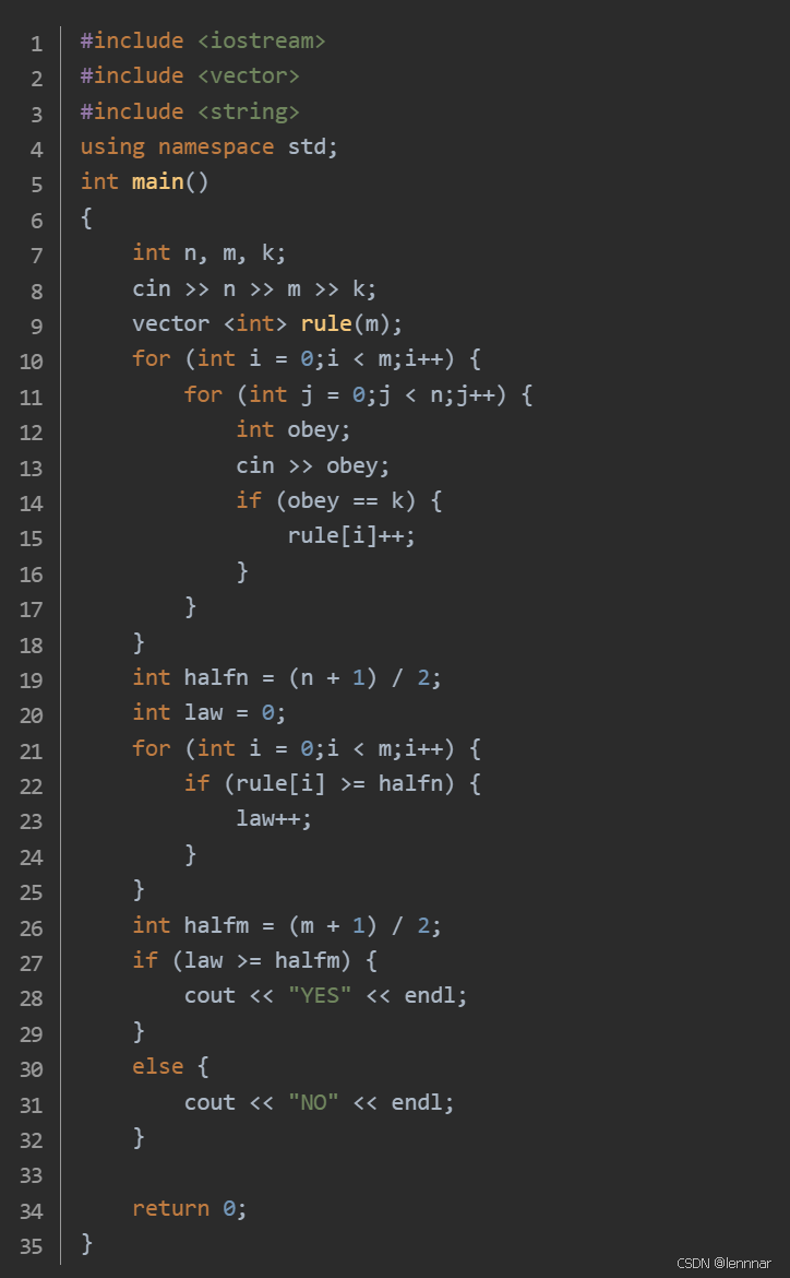 利用遍历计算遵守k的人数,再利用变量law记录遵守超过一半的天数,最后与总天数比较