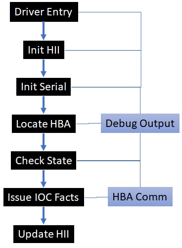 本指南解释了提供的UEFI驱动(DummyDriver.c)和MPI头文件(mpi2.h)中的代码流程和关键函数。该驱动使用MPIv2(消息传递接口)与9400-16i主机总线适配器(HBA)交互,通过UEFI HII(人机界面基础设施)显示HBA信息。