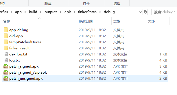 等待一段时间后来到我们的app\build\outputs\apk\tinkerPatch\debug。这里有3个apk: