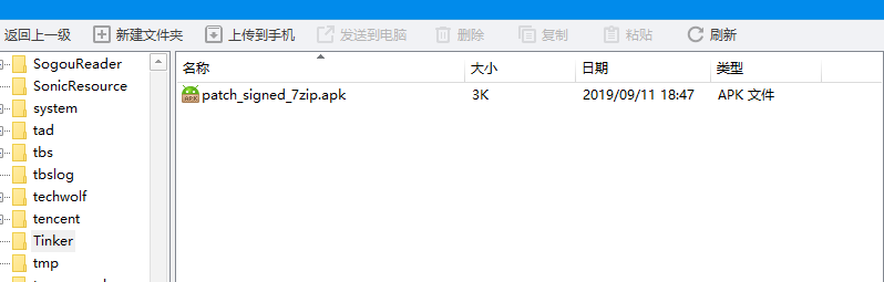 然后通过手机助手,或者别的途径把我们的patch_signed_7zip.apk拷贝到/sdcard/Tinker/文件夹里如:
