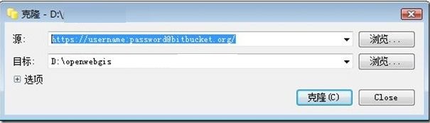 当需要在一个文件夹中第一次克隆服务器的代码时,在如下界面中的“源”地址中,包含用户名和密码即可:
