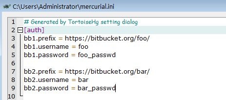 上面已经看到,对每一个代码库,如果都将用户和密码信息放在hgrc中,那么密码将分布在很多地方,安全性是最低的。还好,TortoiseHg提供了一个全局设置,类似于asp.net的machine.config文件,对于所有代码库,都生效,这个文件在windows系统中,一般是mercurial.ini文件(可以通过在文件夹中右键-TortoiseHg-全局设置,然后选择右上角的“编辑文件”按钮打开)
