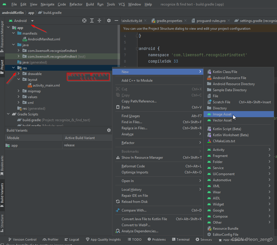 运行image asset studio,在android studio中,项目栏中,选Android,点开app,找到res,右键鼠标,出现右键菜单:New->Image Asset, 如下图: