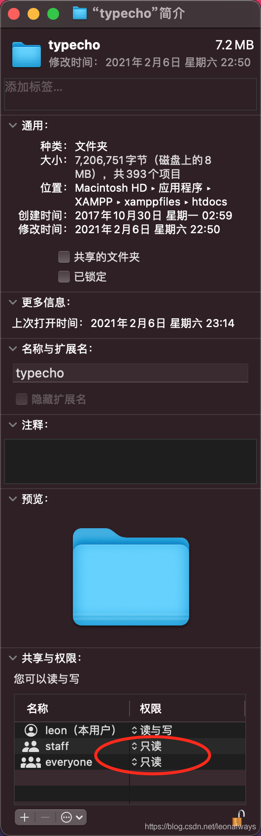 本文介绍了一种因文件夹访问权限导致的问题及其解决方案。通过将文件夹权限设置为everyone读写,可以解决从/Applications/XAMPP/xamppfiles/htdocs/typecho/usr/db.db路径开始的各个层级文件夹的访问限制。