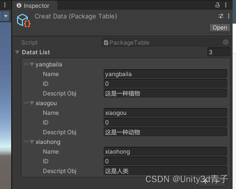 这段代码的作用是创建一个可以在 Unity 编辑器中创建和管理的数据表,其中可以存储多个物品的信息,比如名称、ID 和描述等。通过 `PackageTable` 类的 `DatatList` 可以轻松地添加、编辑和删除 `ObjectInformation` 类的对象,这些对象可以在游戏中使用,比如用于管理背包物品或者游戏中的其他数据。