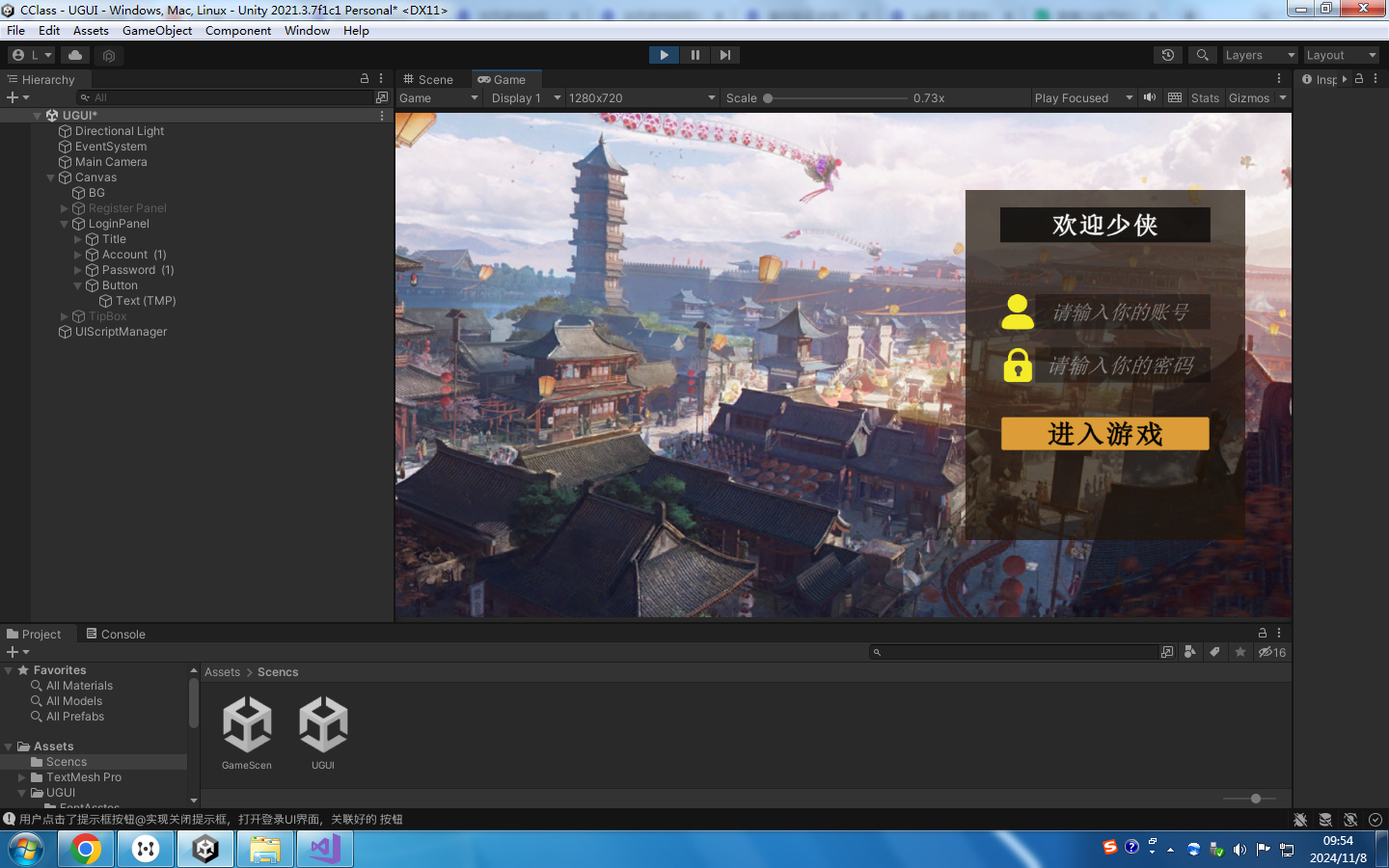 登录界面:用户点击登录按钮后,关闭登录界面,跳转到游戏场景。