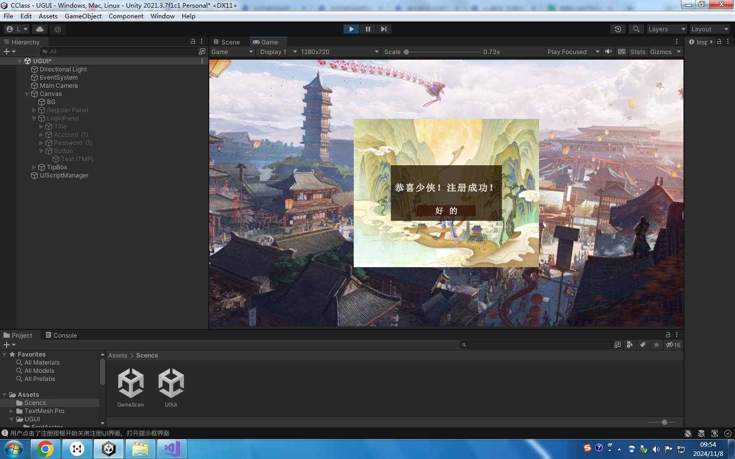 通过这些设置,你的场景和代码将能够完美配合,实现注册、提示框确认、登录和场景跳转的功能。