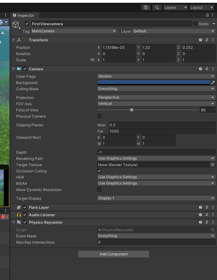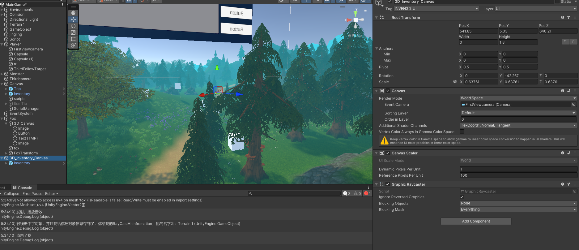 那个摄像机将来会看这个UI就把谁挂进去,并且3D画布下面的UI按钮需要被电击的话就需要摄像机身上必须挂在Physics Raycaster组件