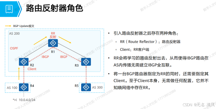 前面我们提到了IBGP水平分割造成IBGP路由器无法获得路由,我们采用IBGP全互联的方式使得IBGP路由之间得以通告路由,但是采用全互联的方式太麻烦,需要我们维护的设备太多。因此我们引入了一个概念叫做路由反射。
