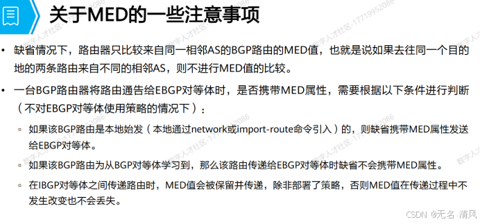 MED用于AS之间影响BGP路由的选路,当路由传递给对等体后,对等体在传递给另一个AS的时候,是不携带MED值的。