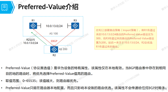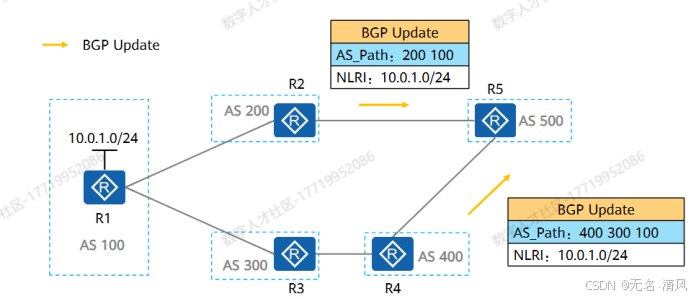 如图所示,当其他条件相同的时候,R5在进行路由学习的时候,会优先选择AS_path数量少的。